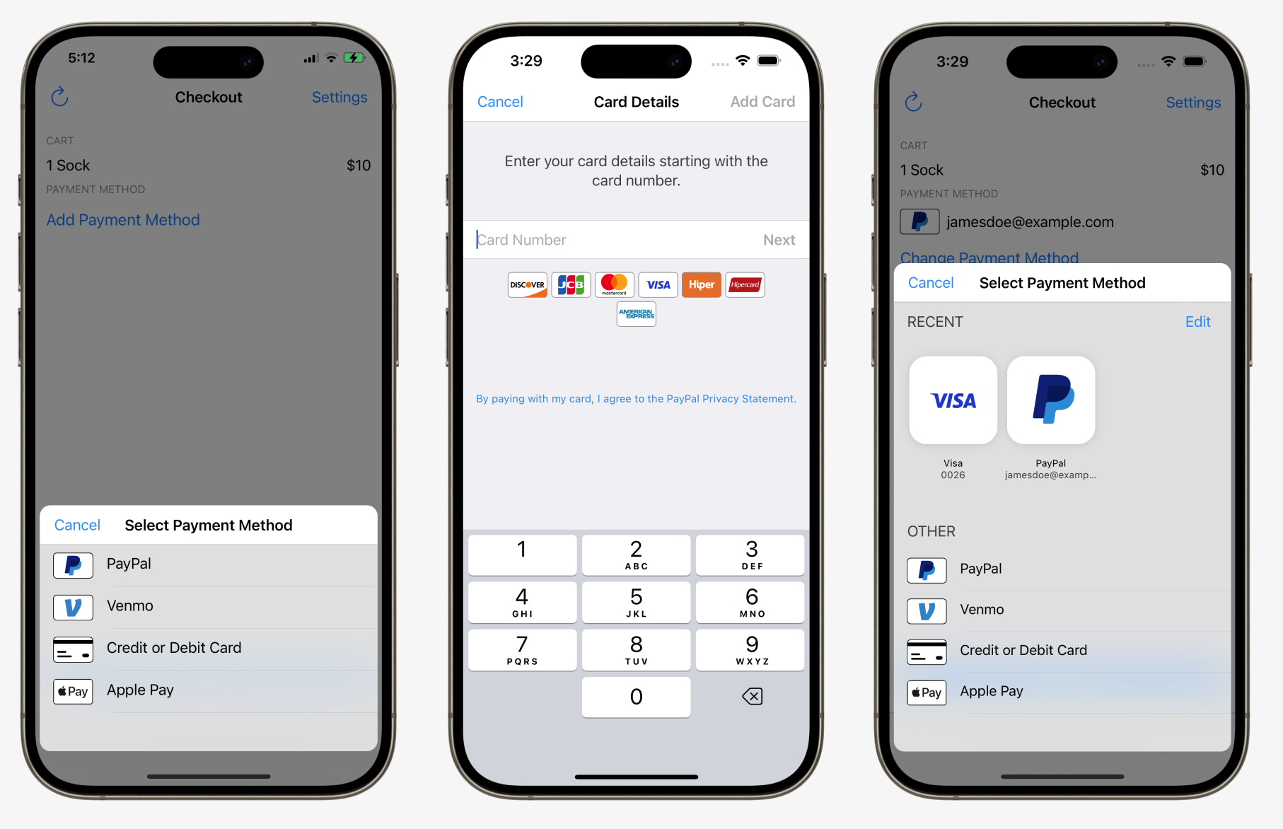 Our Drop-in UI is a complete, ready-made payment UI that offers a quick and easy way to securely accept payments. The UI includes a card entry form and, if enabled, Apple Pay, PayPal, and Venmo buttons. When a user successfully completes the UI, your client code obtains a payment method nonce for use on your server.