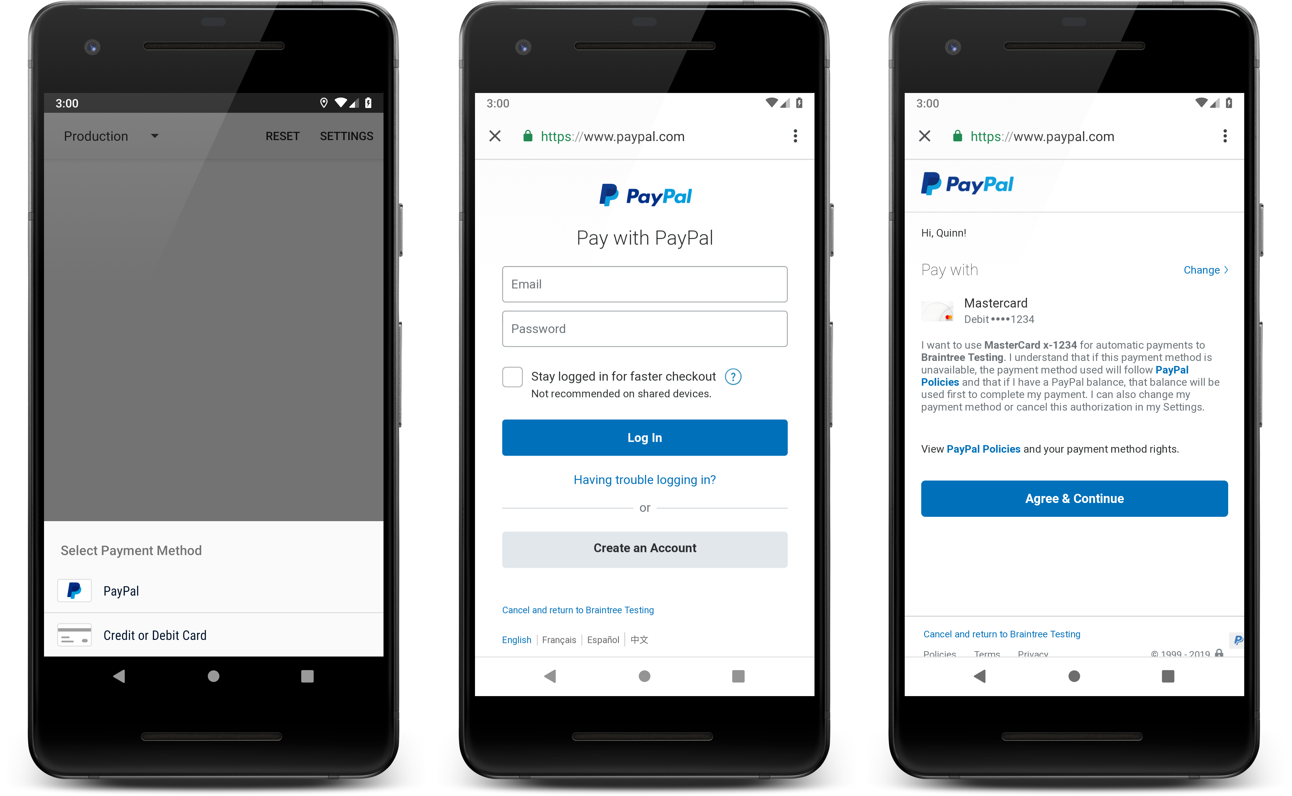 // ONLY REQUIRED IF YOUR ACTIVITY LAUNCH MODE IS SINGLE_TOP override fun onNewIntent(intent: Intent) { super.onNewIntent(intent) handleReturnToApp(intent) } // ALL OTHER ACTIVITY LAUNCH MODES override fun onResume() { super.onResume() handleReturnToApp(intent) } private fun handleReturnToApp(intent: Intent) { // fetch stored PayPalPendingRequest.Success val pendingRequest: String = fetchPendingRequestFromPersistantStore() when (val paymentAuthResult = payPalLauncher.handleReturnToApp( pendingRequest = PayPalPendingRequest.Started(pendingRequest), intent = intent )) { is PayPalPaymentAuthResult.Success -> { completePayPalFlow(paymentAuthResult) // clear stored PayPalPendingRequest.Success } is PayPalPaymentAuthResult.NoResult -> { // user returned to app without completing PayPal flow, handle accordingly } is PayPalPaymentAuthResult.Failure -> { // handle error case } } } private fun completePayPalFlow(paymentAuthResult: PayPalPaymentAuthResult.Success) { payPalClient.tokenize(paymentAuthResult) { result -> when (result) { is PayPalResult.Success -> { /* handle result.nonce <em>/ } is PayPalResult.Failure -> { /</em> handle result.error <em>/ } is PayPalResult.Cancel -> { /</em> handle user canceled */ } } } }Complete Integration