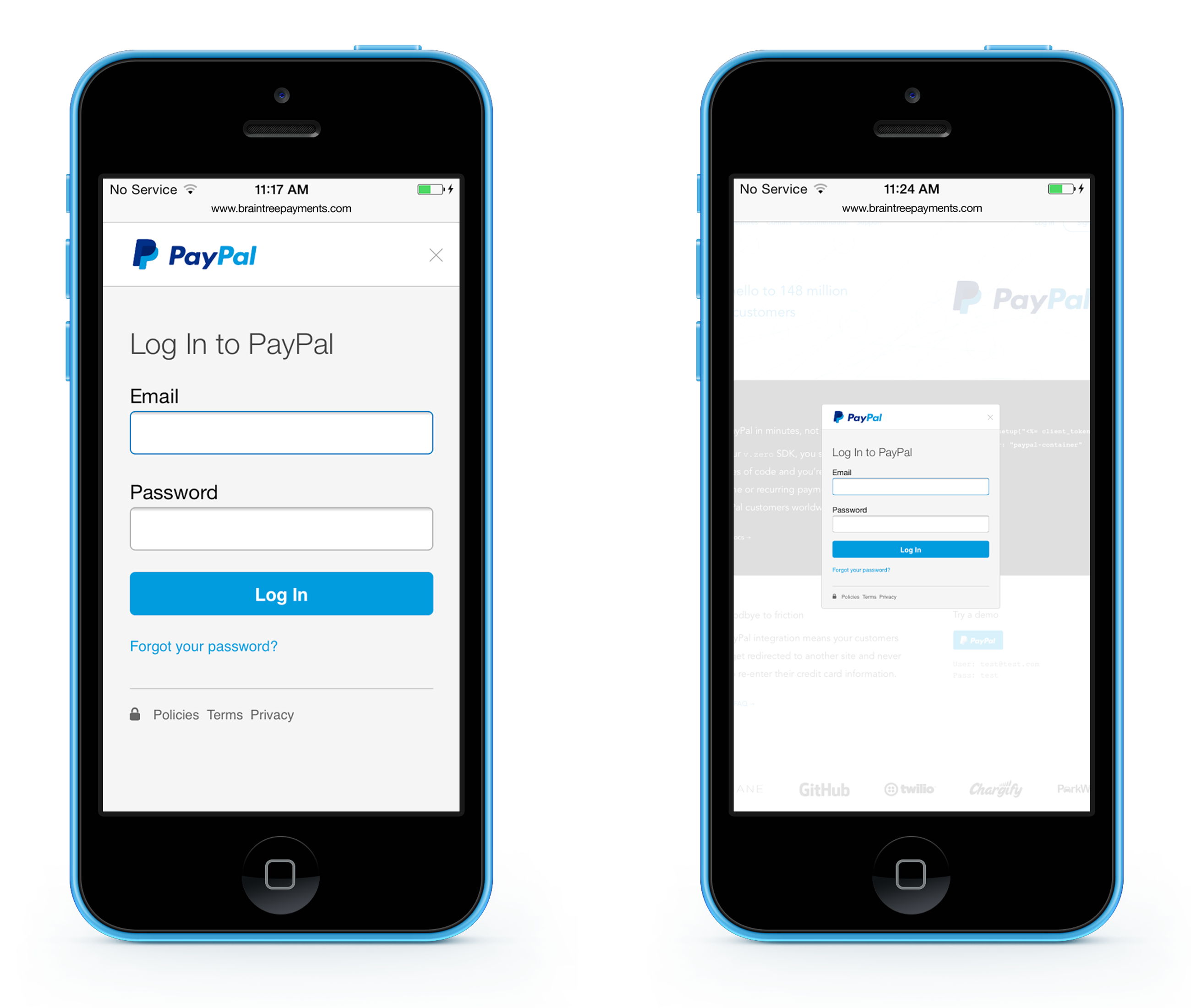 If you intend on using the Drop-in checkout UI or customizing your existing checkout by accepting PayPal, we suggest you include a viewport meta tag in the <head> of your website to ensure injected interfaces, such as lightboxes, display at the proper size on tablets and phones.