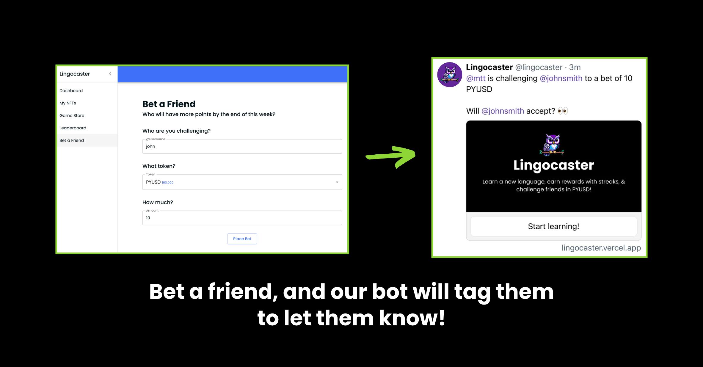 Lingocaster creatively incorporates PYUSD to facilitate challenging friends (and yourself!) on achievements and streaks.
