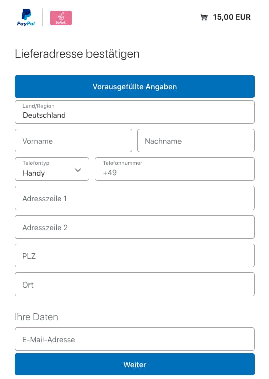 1<script2src="https://www.paypal.com/sdk/js?client-id=YOUR_CLIENT_ID¤cy=EUR&locale=de_DE&buyer-country=DE">3// Required. Replace YOUR_CLIENT_ID with your sandbox client ID.4</script>